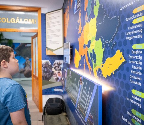A fogadótérből nyíló első kiállítótérben két fő egység kapott helyet. Baloldalon a modern, high-tech haderő lenyűgöző képi és installációs elemei tárulnak a látogatók elé. A látványos vizuális anyagok és tárgyi elemek nemcsak a földi és vízi erők eszközeit mutatják be, hanem érzékletesen jelenítik meg a katonák szolgálatának emberi oldalát is. Néhány képen keresztül a légierő is megjelenik, így a látogatók átfogó képet kaphatnak a honvédség működésének sokszínűségéről. A tér jobb oldalán megújult NATO tájékoztató pont látványos grafikai elemekkel és informatív tartalommal segíti a látogatók eligazodását a szövetség működésében. Egy átfogó idővonal mutatja be a NATO történetének mérföldköveit 1949-től napjainkig, a tagság bővülését, a legfontosabb missziókat és biztonságpolitikai eseményeket. A falon feltüntetésre került valamennyi tagország csatlakozási éve, valamint külön tábla foglalja össze a NATO biztonsági együttműködéseinek különböző formáit – így a Partnerség a Békéért programot, a Mediterrán Párbeszédet, az Isztambuli Együttműködési Kezdeményezést és a Globális Partnerséget. A tér vizuális elrendezése és színvilága modern, figyelemfelkeltő módon jeleníti meg a NATO globális jelenlétét, a szövetségi együttműködések célját és Magyarország helyét e nemzetközi szervezetben. Ebben a helyiségben két érintőképernyős információs oszlop is elhelyezésre került, amelyek korszerű, felhasználóbarát módon segítik a látogatókat a kiállítás tartalmi eligazodásában.