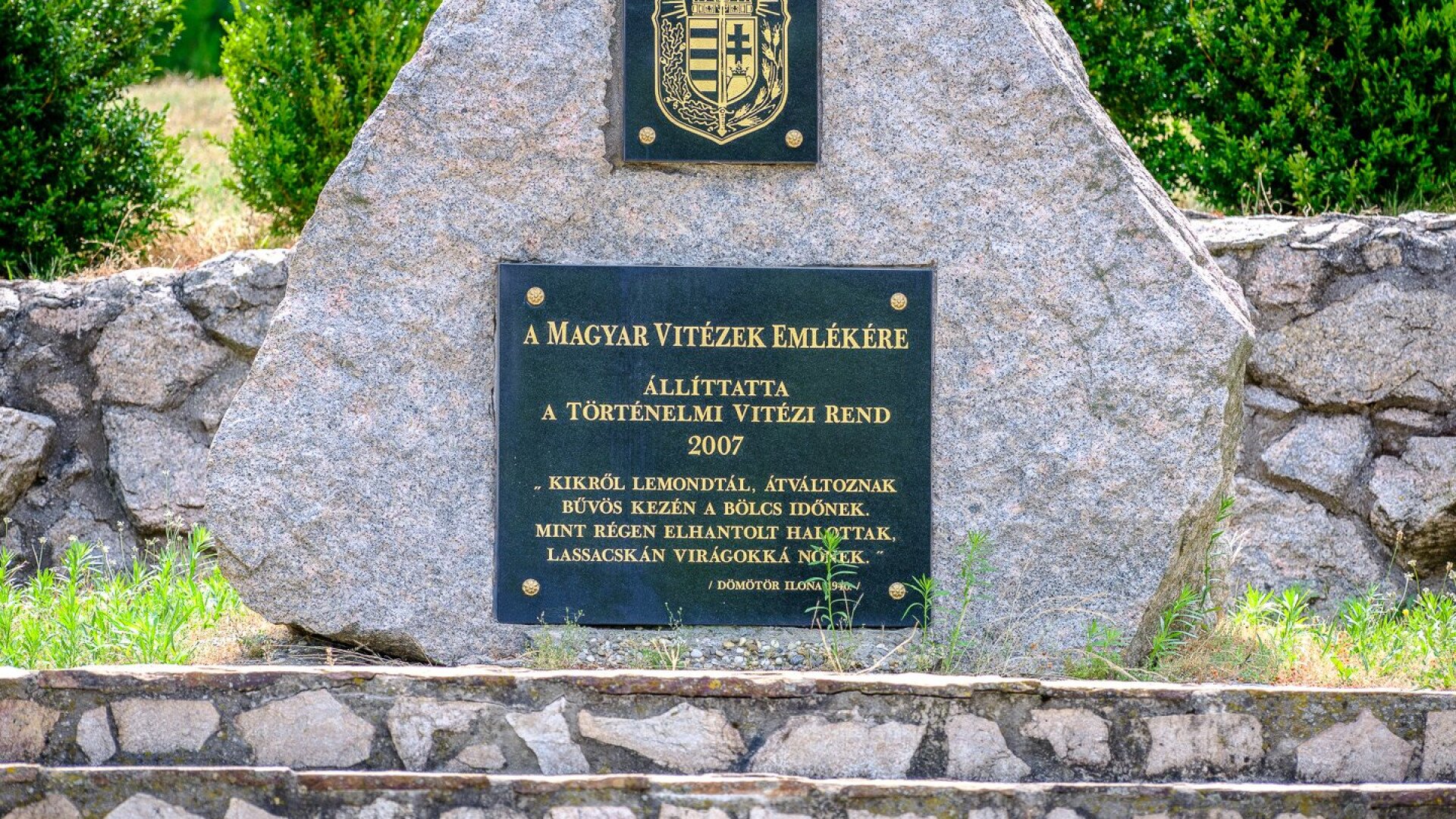 Az Emlékponton elhelyezett gránittáblán olvasható idézet – Dömötör Ilona költeményének részlete – bensőségesen idézi meg azt az átalakulást, amely során a múlt hőseinek példája idővel virágzó örökséggé válik: „Kikről lemondtál, átváltoznak / bűvös kezén a bölcs időnek. / Mint régen elhantolt hajtások, / lassacskán virágokká nőnek.”